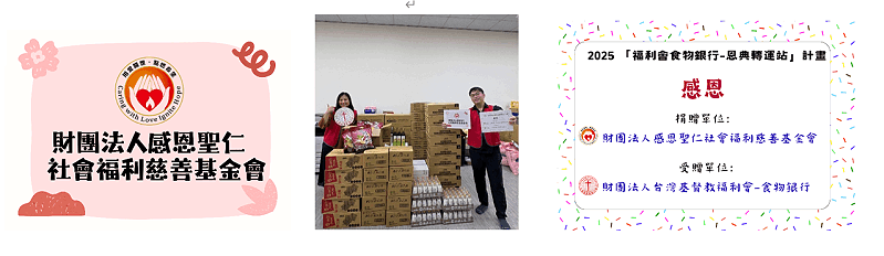 本會羅東食物銀行「2026年度福利會食物銀行-恩典轉運站」,榮獲感恩聖仁慈善基金會2026年度物資捐贈,該捐贈用於2026年度食物銀行之家戶,同時,我們將致力於:1.提供物資關懷服務於宜蘭縣96戶長者家戶及獨居長者,確認長者生活安全無虞及基本生活權益穩定。 2.與結合夥伴單位共同合作,提升本方案服務量能。 3.透過物資關懷服務,發揮並傳揚本會服務宗旨,造福宜蘭縣長者及獨居長者。 感謝感恩聖仁基金會的肯定與支持,為更多有需要的家戶提供幫助與支持。